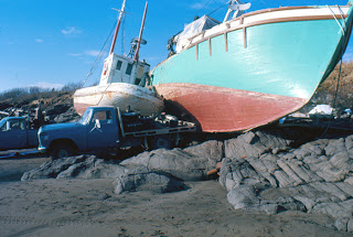 Usually in going "behind the art" I deal with some aspect of painting water, reflections, how light behaves on water. But today I will use this painting to illustrate effects of light and shade, since we have a strong sense of bright, overhead light, with equally strong shadows.If we look at the man holding the harpoon, notice how much contrast there is under the shade of the bill of his cap. Making this shade very dark gives the suggestion of how bright the overhead light is. Furthermore, having good light and shade contrast helps to define the harpoon better.